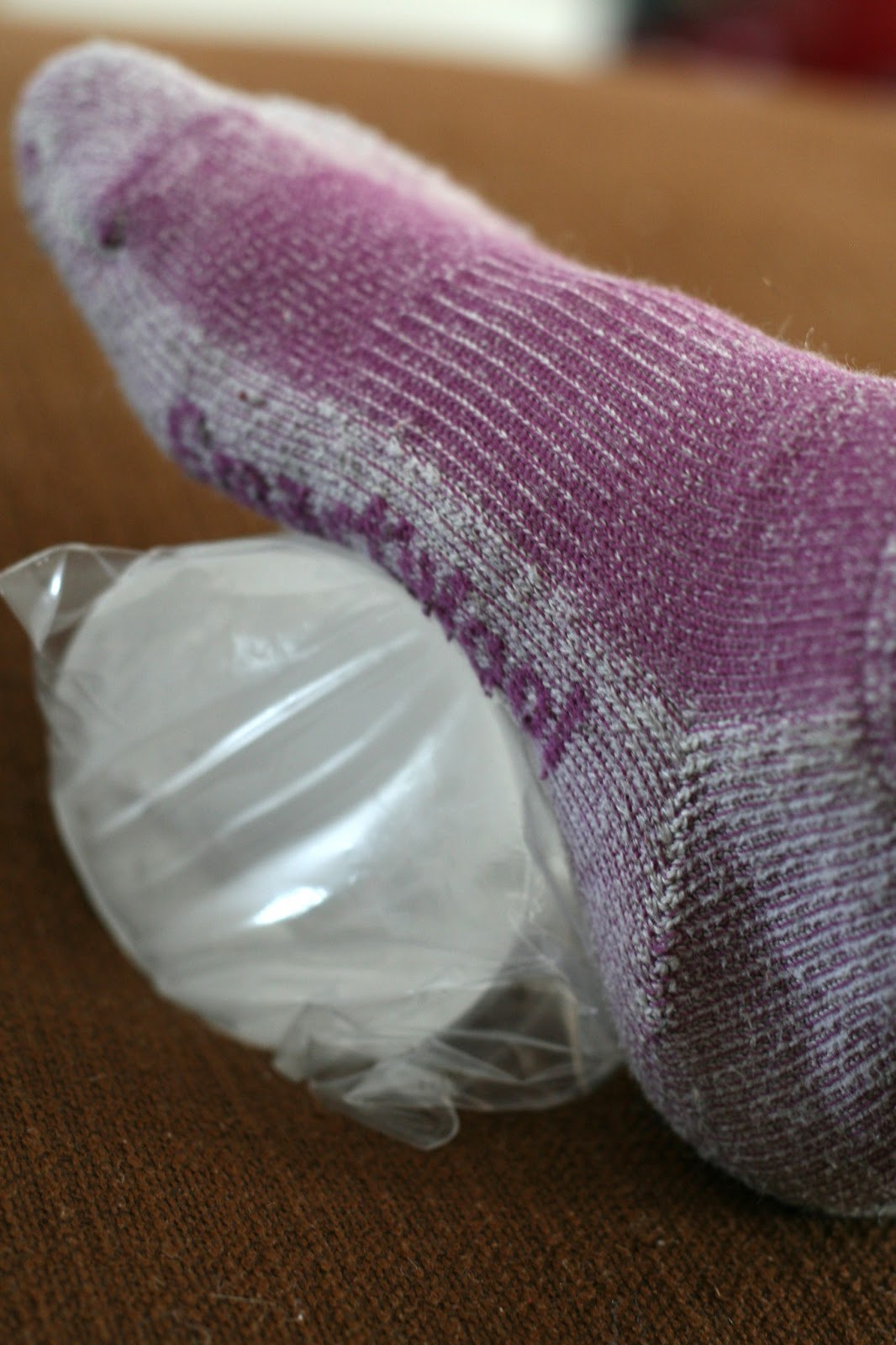 - Ice your foot minimally 2 times a day. Best thing to do is to take a disposable cups and fill them halfway with water and freeze. Run the frozen cup under warm/hot water for half a minute or until it easily comes out and place into a ziplock bag. Try to get the air out as best as possible. Roll the ice on the arch of your foot for at least 15 minutes. I always wear wool socks and that kept a perfect barrier from the ice so I didn’t hurt my foot with it being too cold. If you dont have wool socks you can add more layer of socks until your foot is chilled but not in any pain from the cold. I kept 3 cups on rotation in the freezer; took one out, put one in and if I didn’t get around to replacing it, I had two backups!